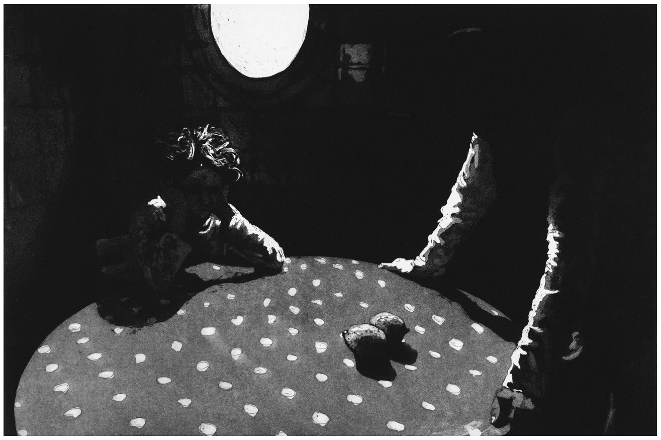 «Sobre la mesa», Pablo Flaiszman (2015), aguafuerte – aguatinta sobre papel (57×76 cm, plancha: 40×60 cm).